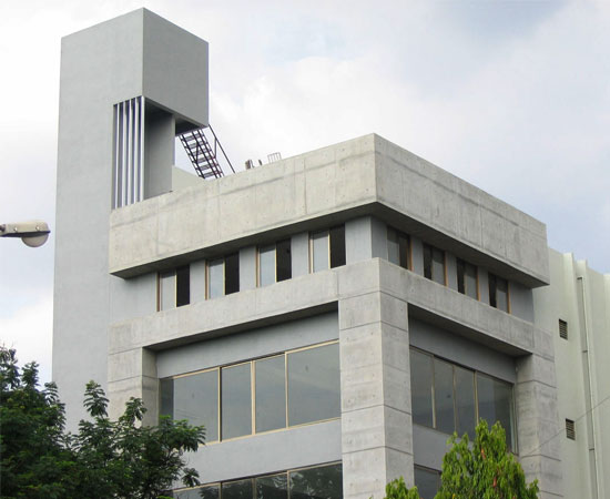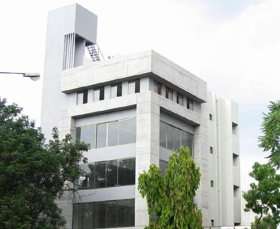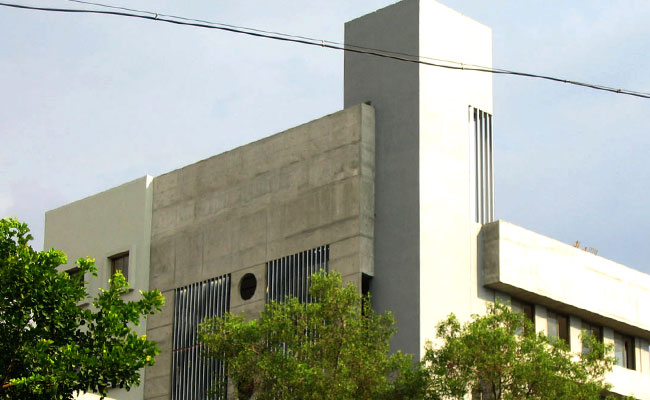 Our first attempt into commercial building has drawn attention of several corporate sections. The exterior is a mature combination of exposed concrete, aluminum fins and glass panels. Bet, no one can miss this while driving through the hustling Vijay Cross Roads.